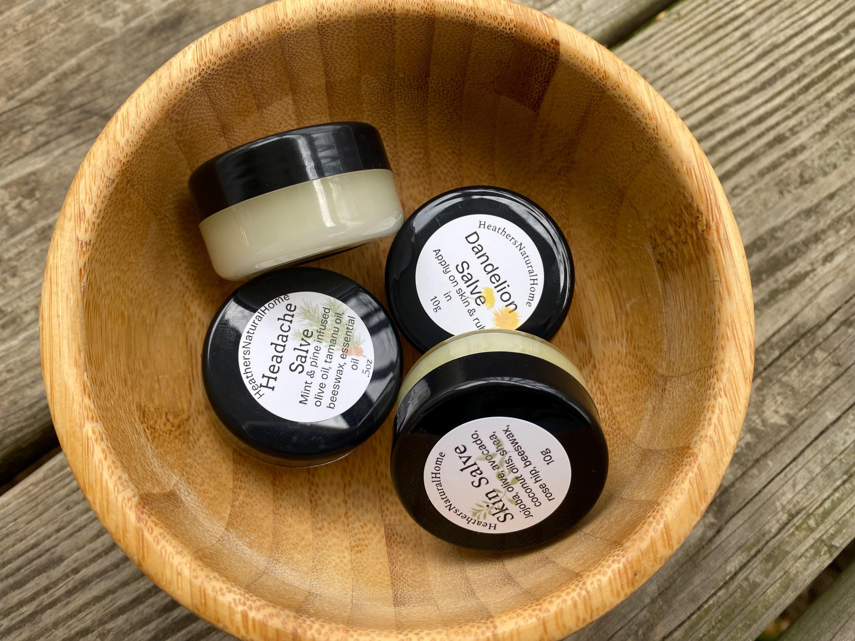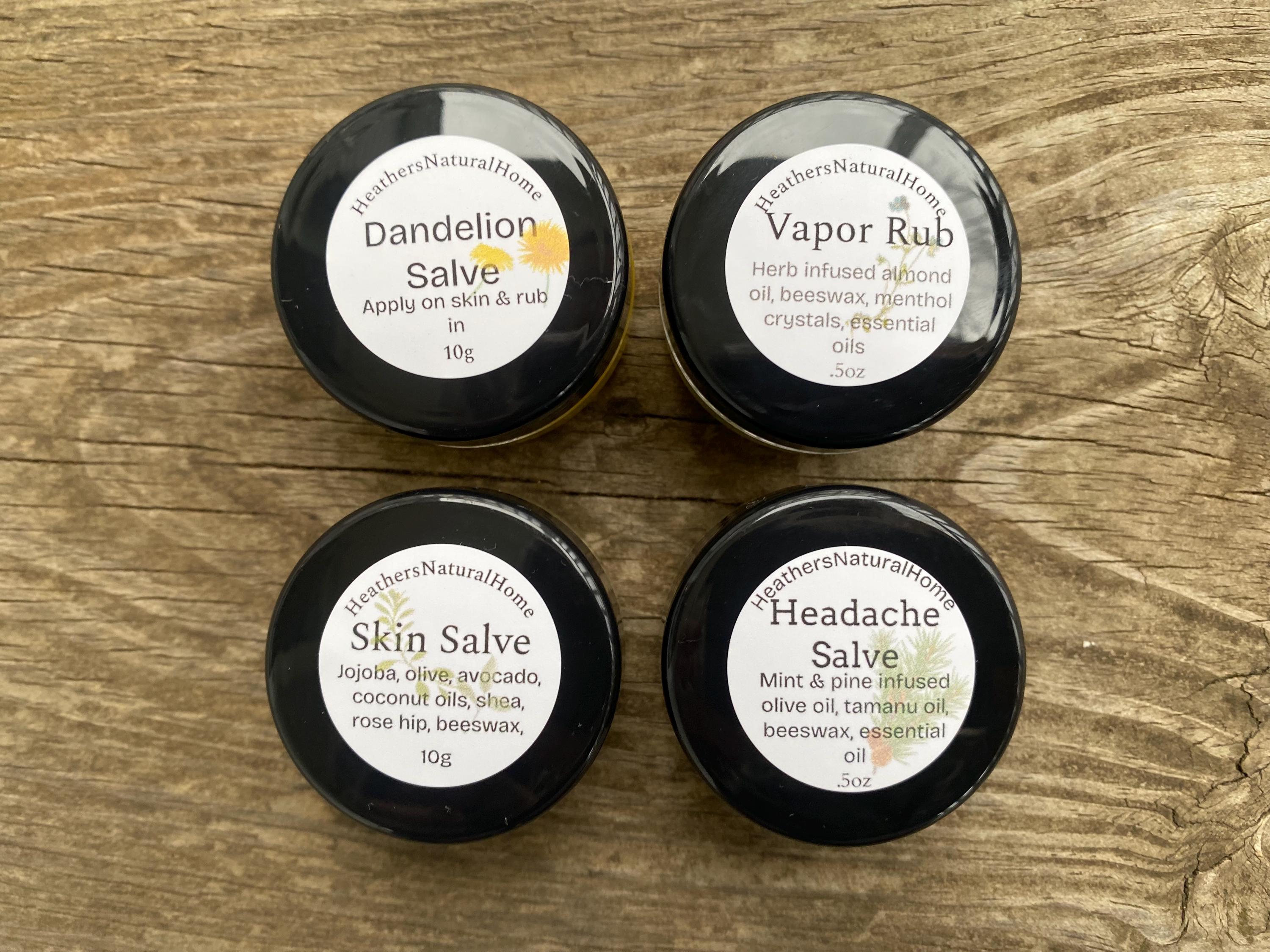 This set comes with 4 mini salves. Peppermint Pine Headache Salve, Dandelion Salve, Menthol Vapor Rub, & Dry Skin Salve.